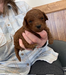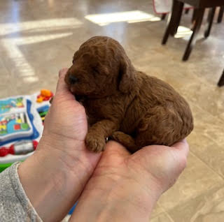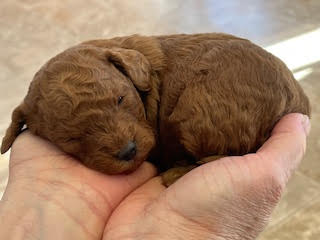 Ruby female: Ruby has the most white from the 3 pups in this litter, with just a touch on the tip of her chin and a splash of white on her chest. Ruby will be 12-14 lbs as an adult.